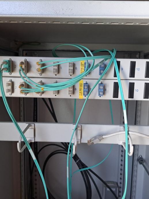 Optika: 2x ladice/patch paneli za optiku s ugrađenim spojnicama (konektorima) i organizatorima (vidljivi tirkizni optički kabeli).