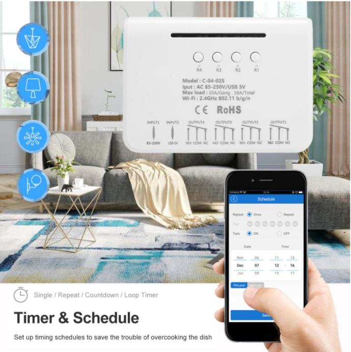 * Podržava daljinsko uključivanje i isključivanje povezanih uređaja, kao što su svjetla, električni bojler, električni štednjak, ventilatori, klimatizacija, električne zavjese itd.