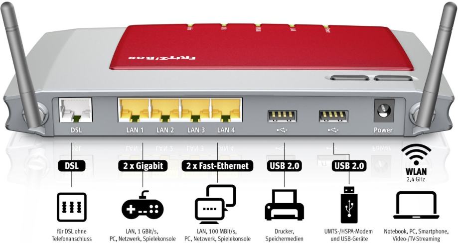 2 x USB 2.0 za mrežno dijeljenje pisača, pohrane (USB stick, eksterni HDD) ili 3G/4G USB stick za Internet