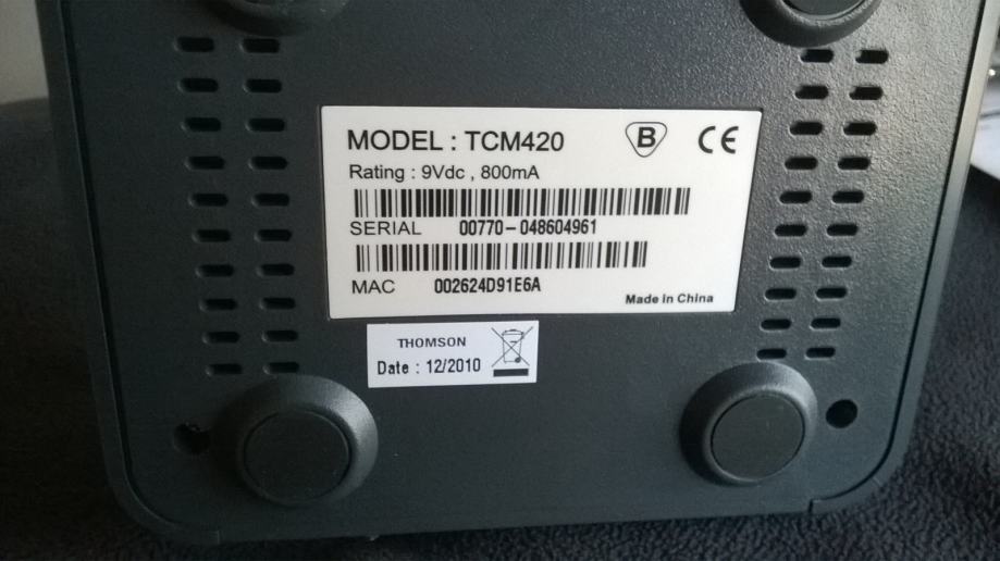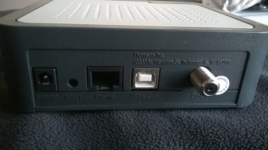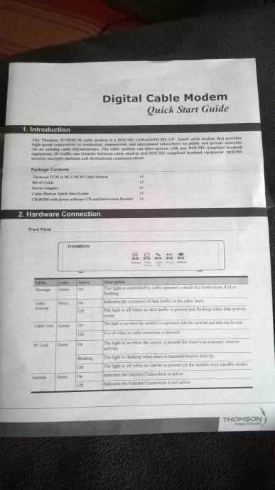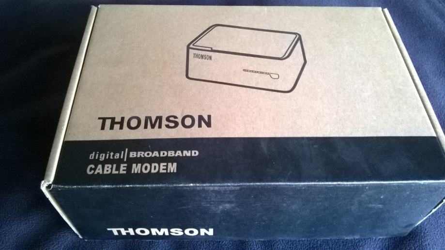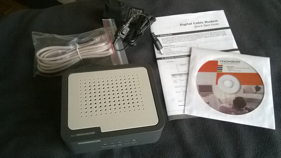 Digitalni kablovski modem Thomson. Novi uređaj, originalno pakiranje, nikad korišten. Model TCM420, 9Vdc, 800mA. Sa svim pripadajućim dodacima: kabel, ispravljač, instalacijski CD, tiskane upute.