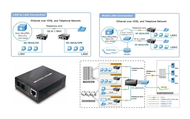 Planet VC-201A Ethernet konverter VDSL2 10 / 100M ehternet na parični VDSL2 sustava transfera 90 / 90MB 200m respektivno. 15/5 Mb na 1,6 km, prijenos podataka i video signala