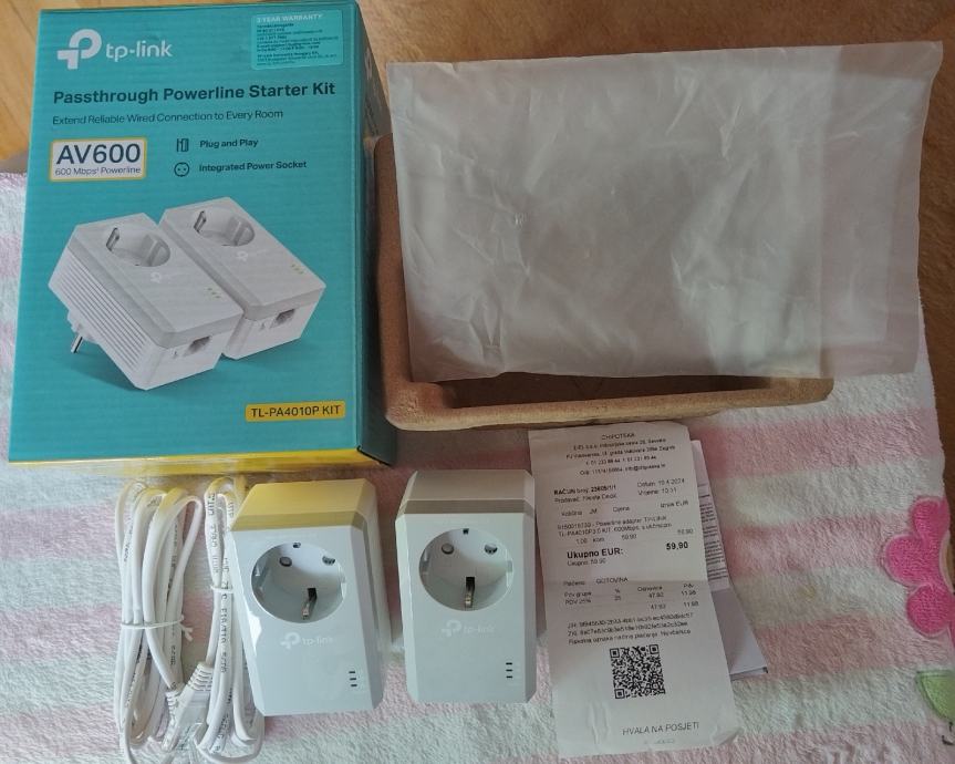 TP Link AV600 Powerline mrežni adapter, 600 Mbps, 1 mrežni ulaz, dodatna strujna utičnica, novo, nekorišteno, račun, garancija 24 mjeseca.