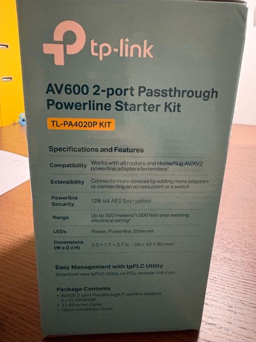 Set uključuje dva adaptera s AV600 tehnologijom koja pruža brzinu do 600 Mbps preko powerline veze. Svaki adapter ima integriranu utičnicu, tako da ne gubite postojeću utičnicu, te dva Ethernet porta za povezivanje mrežnih uređaja. Kompatibilan je s HomePlug AV/AV2 adapterima i podržava 128-bitnu AES enkripciju za sigurnu vezu.