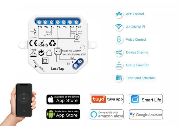 WiFi daljinski upravljač Smart Tuya upravljačka sklopka LoraTap za upravljanje pogonskim motorima roleta, roleta, zavjesa, vrata i ostalih dvokanalnih upravljačkih sklopova prema gore ili dolje. zatvaranje i otvaranje putem uz mogućnost spajanja običnih tipki ručnog tipa za rolete.