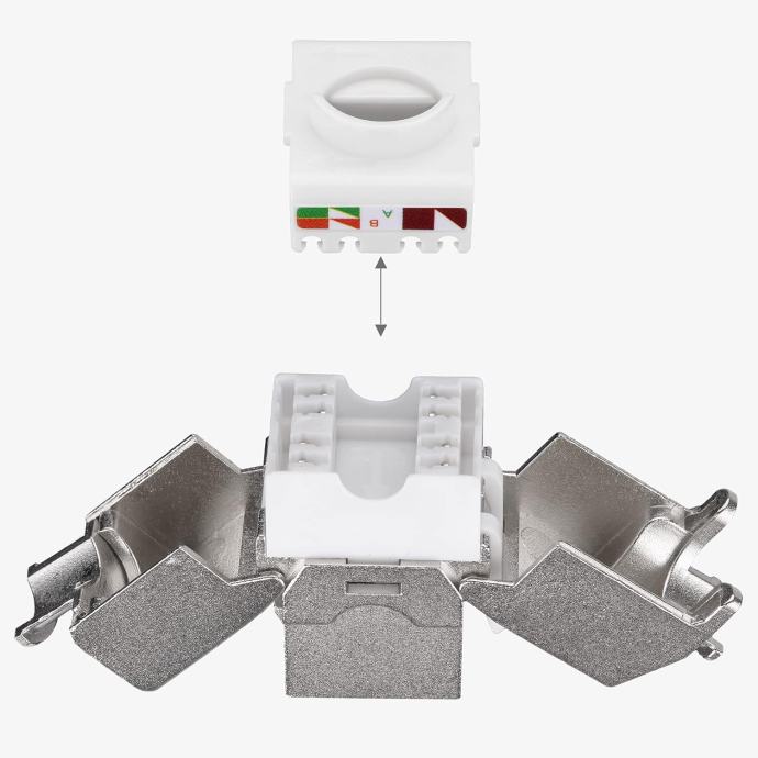 Nije potreban alat: zahvaljujući standardiziranom zatvaraču na snap-in, za montažu CAT6A kabela nije potreban alat. RJ45 konektori mogu se jednostavno i čvrsto stegnuti u modul.