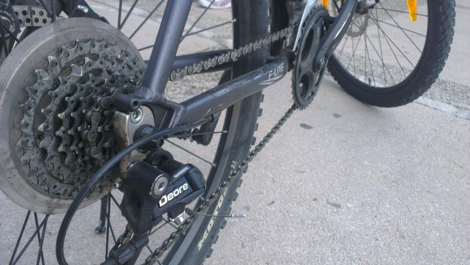 Shimano SL-M390 9 speed Rapid Fire shifters, Shimano Alivio front derailleur, Shimano Alivio rear derailleur, Suntour XCR crankset KMC Z99 chain, Sram PG-950 Cassette