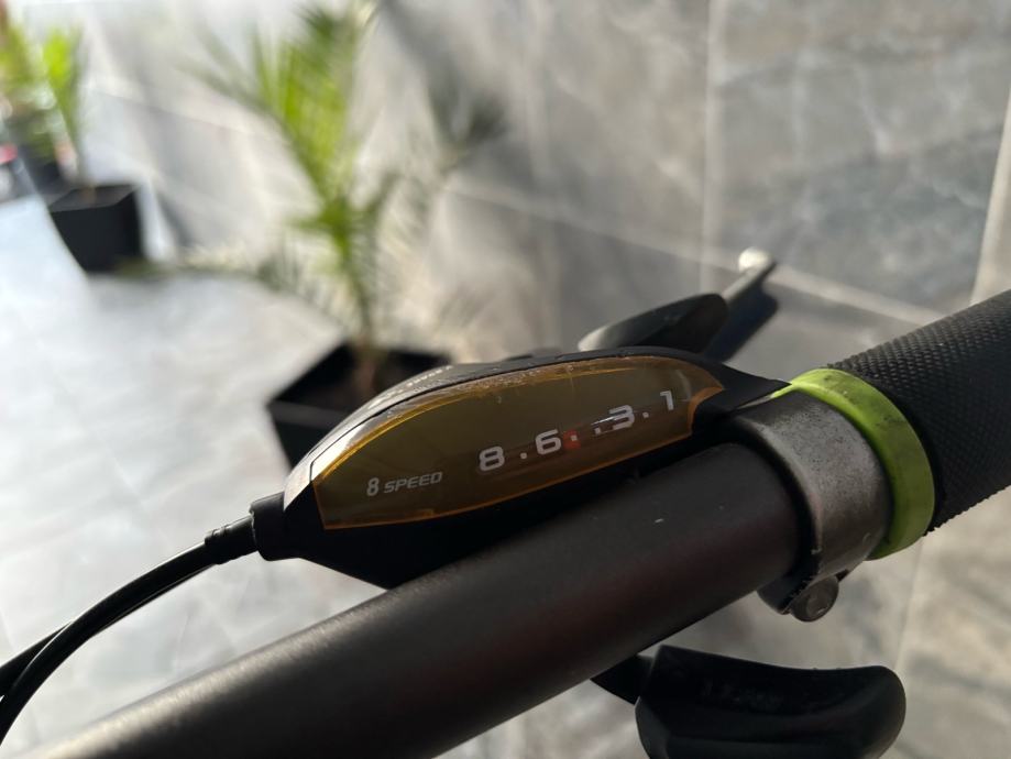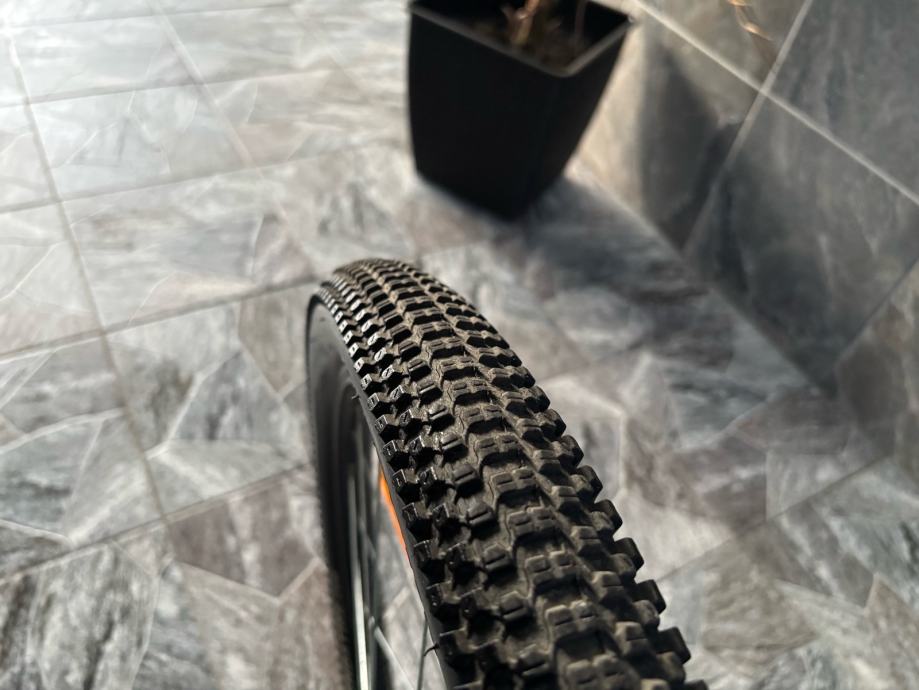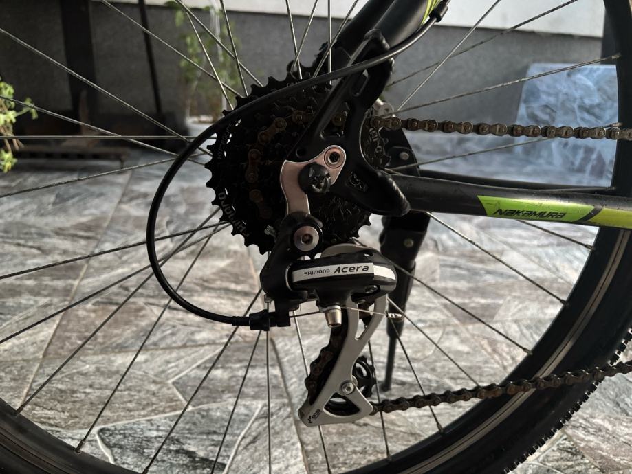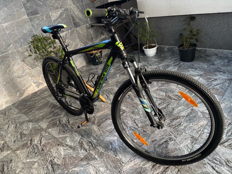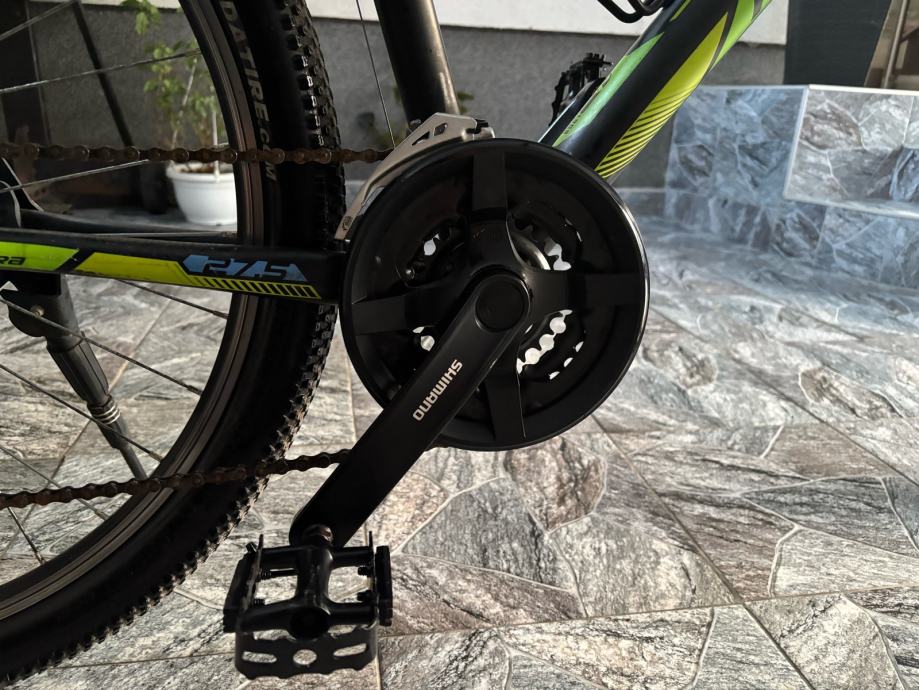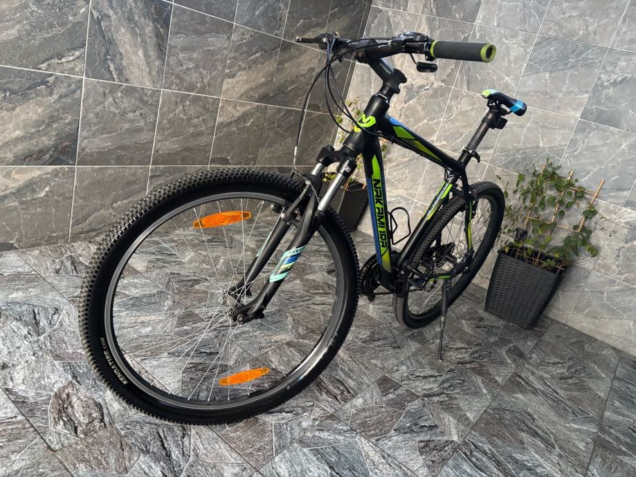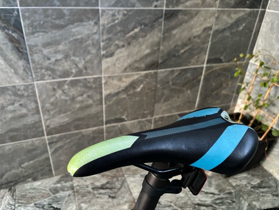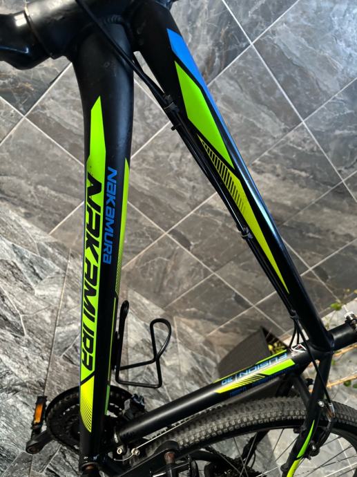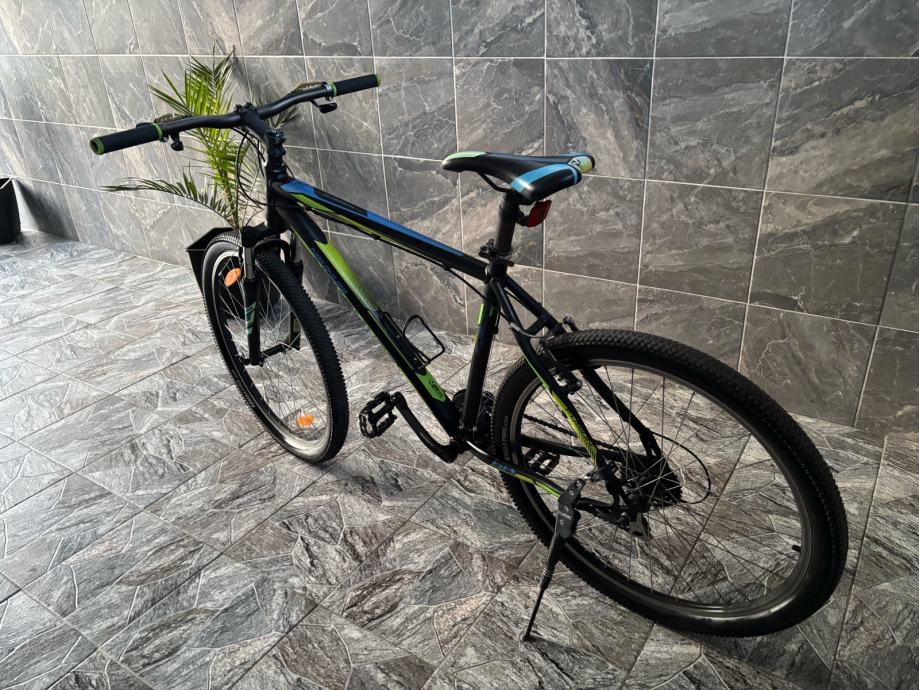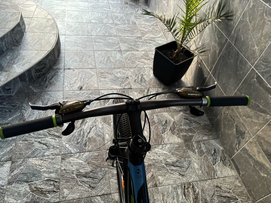 Prodajem MTB bicikl s kotačima veličine 27.5 inča, muške geometrije rama. Bicikl je crne boje s zelenim i plavim detaljima, opremljen prednjom amortizacijskom vilicom i terenskim gumama. Upravljač i sjedalo su u skladu s ostatkom bicikla, a cijeli set izgleda uredno i funkcionalno.