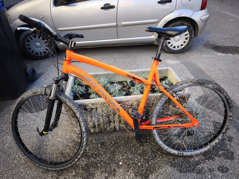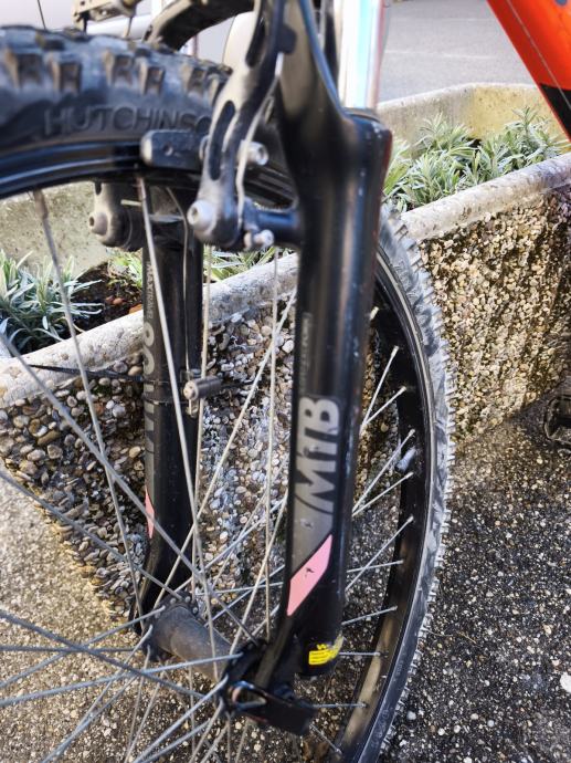 Prodajem MTB bicikl s okvirom veličine M, s kotačima od 26 inča. Okvir je narančaste boje, a vilica je crna s MTB oznakom. Gume su Hutchinson terenske, prikladne za vožnju po različitim podlogama. Bicikl je u voznom stanju i je potrebno naraviti generalku