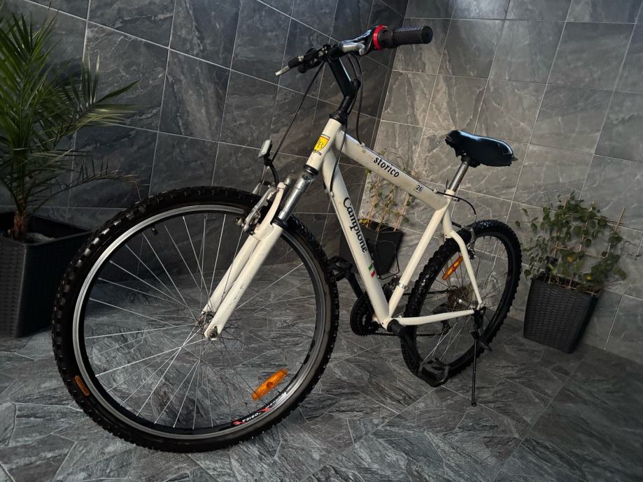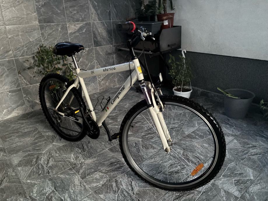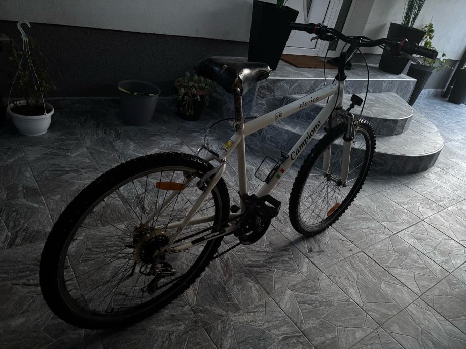 Prodajem MTB bicikl Campione Storico, veličina kotača 26 inča, bijele boje. Bicikl dolazi s prednjom amortizacijskom vilicom, mjenjačima brzina i gumama s terenskim šarom.