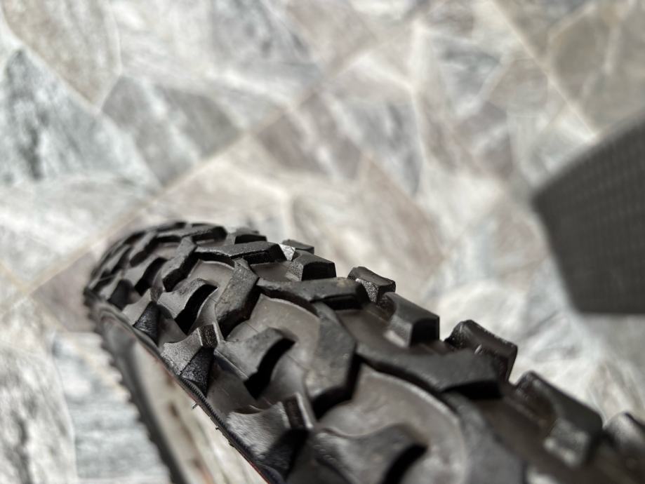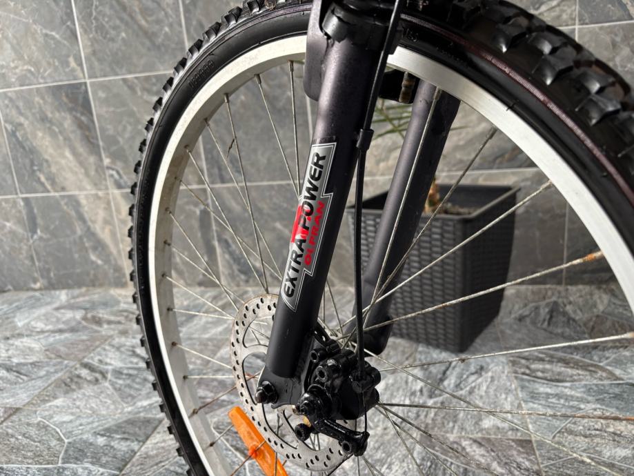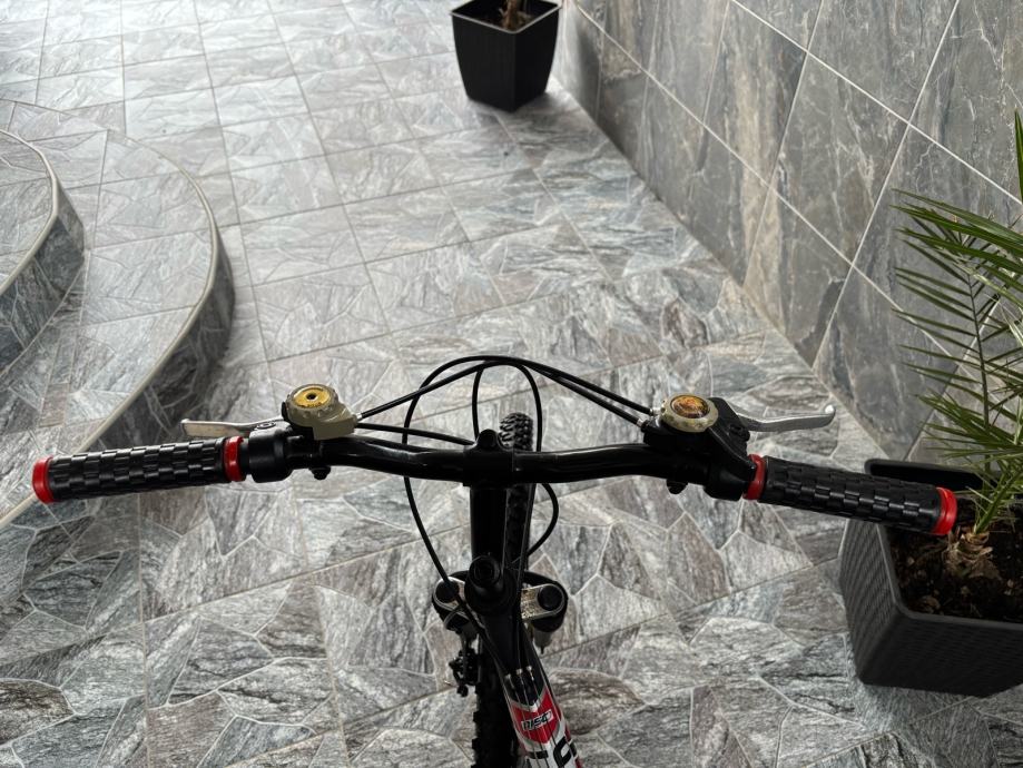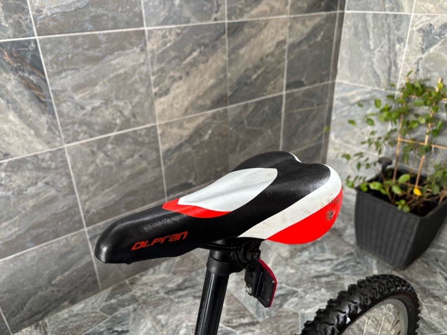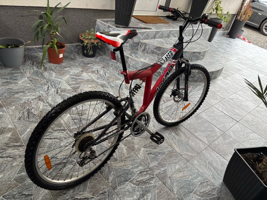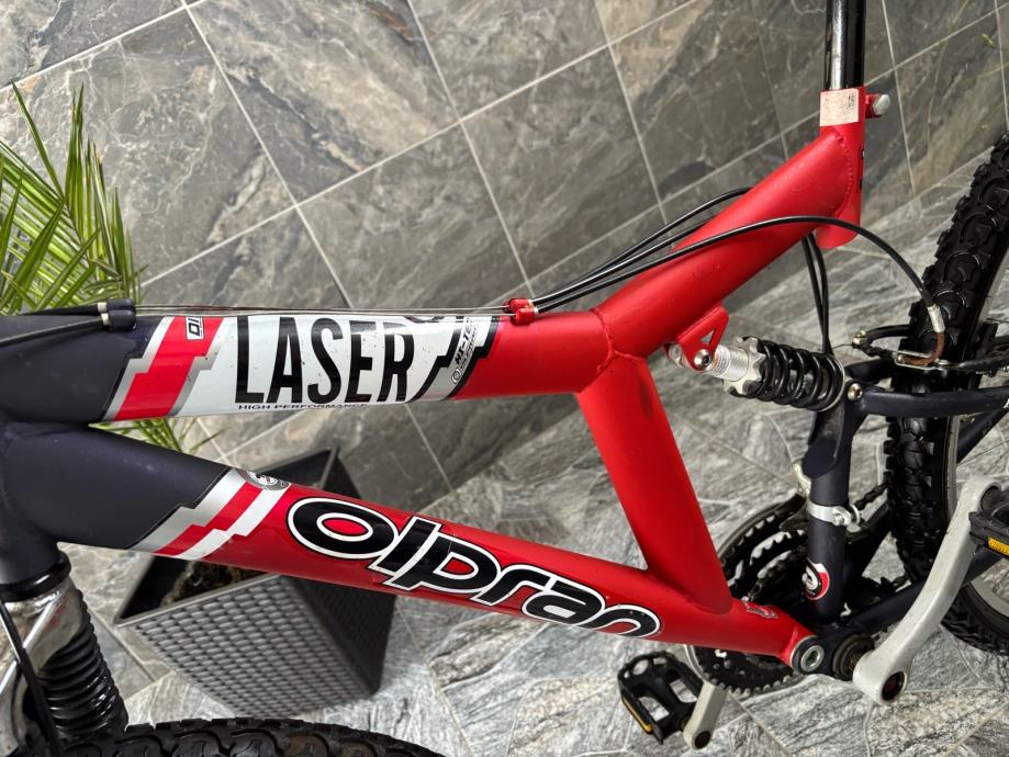 Prodajem rabljeni MTB bicikl Olpran Laser s full suspension okvirom. Radi se o brdskom biciklu s prednjom amortizacijskom vilicom Extra Power i stražnjim amortizerom, disk kočnicama te širim terenskim gumama. Okvir je crvene boje.