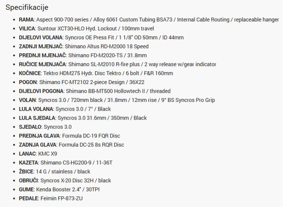 Prodajem Scott Aspect 950 u odličnom stanju. Kotači 29“, veličina rame S (za osobe od cca 160 do 175 cm visine), 18 brzina (Shimano Altus 2x9 brzina), prednja hidraulična vilica Suntor XCT-30-HLO, disk kočnice, kenda gume itd. (detaljna specifikacija u prilogu). Cijena 420 eur.