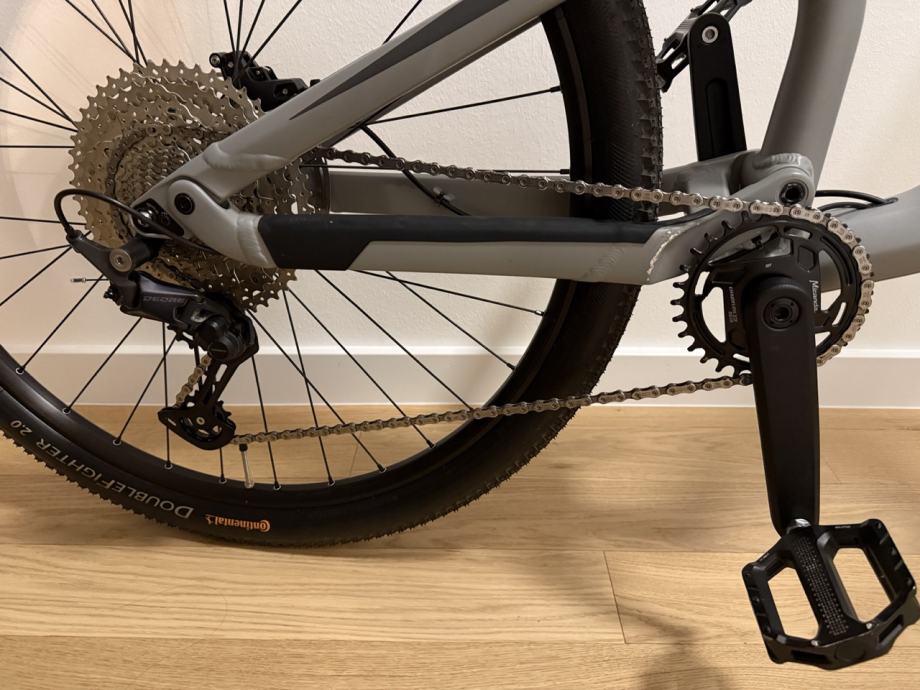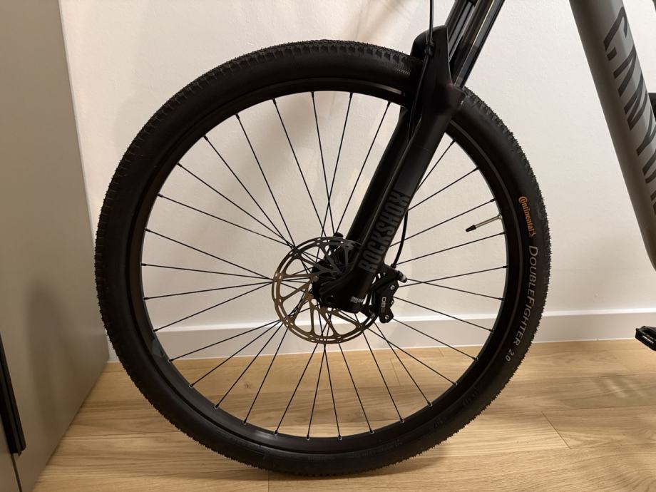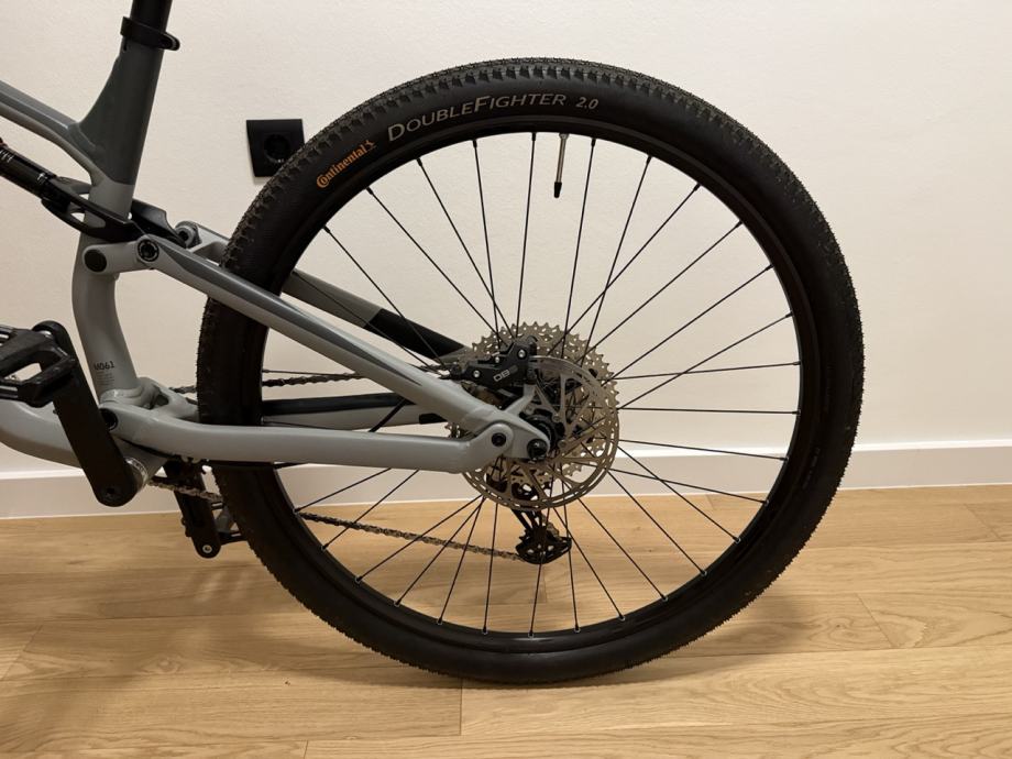 Bicikl je pažen i čuvan u stanu, uz male tragove korištenja - kod pogona gdje lanac zna udariti od ramu, i prednja kočnica ima par ogrebotina. Kutiju nemam. Dolazi s CONTINENTAL Double Fighter 2.0 gumama, te uz bike ostavljam i originalne gume (Schwalbe Nobby Nic 29x2.4" bronze skin) koje su korištene desetak kilometara. Lanac svježe očišćen i podmazan. Uz bicikl dolazi set katadioptera te pumpa za amortizer.