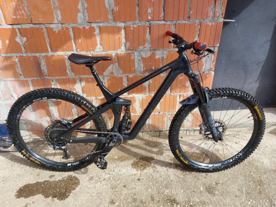 Prodajem Canyon Strive full suspension full carbon MTB bicikl u veličini okvira L (48-52 cm) s kotačima od 29 inča. Radi se o enduro biciklu crne boje s karbonskim okvirom i dvostrukim ovjesom.