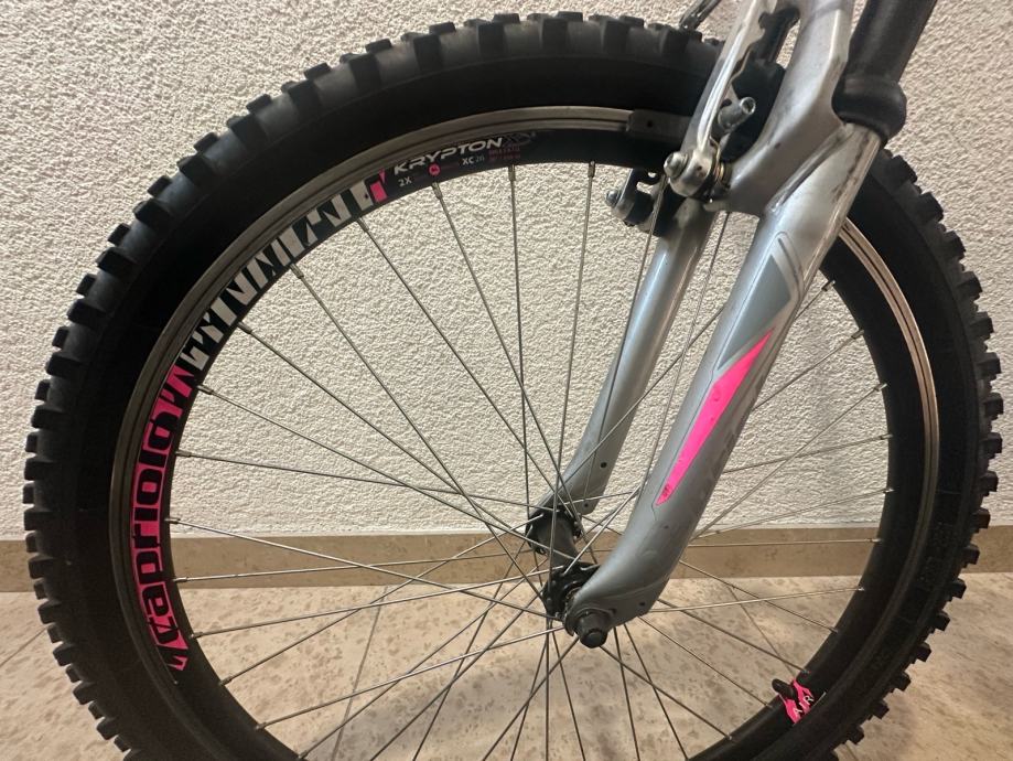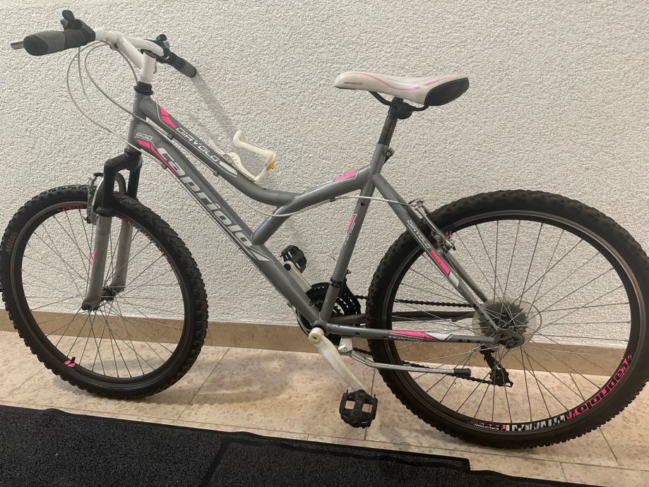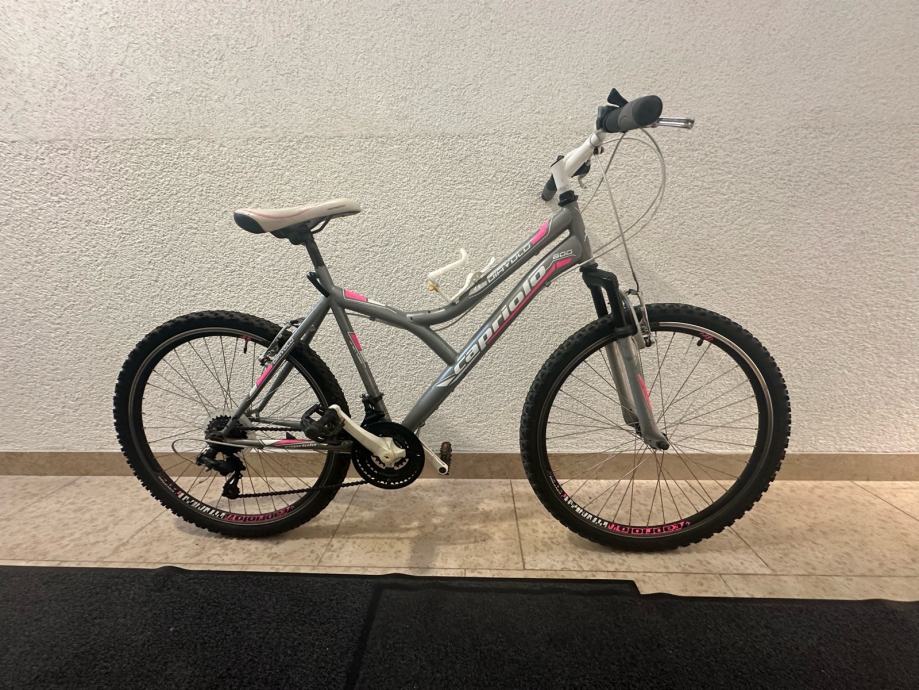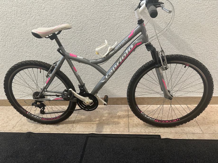 Prodajem ženski MTB bicikl Capriolo Diavolo 600 s kotačima od 26 inča. Bicikl ima L ramu (48-52cm) što je prikladna visina za većinu vozačica. Radi se o pouzdanom modelu s ženskom geometrijom rame koja omogućava udobniju vožnju. Kotači dolaze s crnim gumama s ružičastim detaljima koji se uklapaju s dizajnom bicikla. Opremljen je sa stajaćim točkovima, mjenjačima i amortiziranom prednjom viljicom.