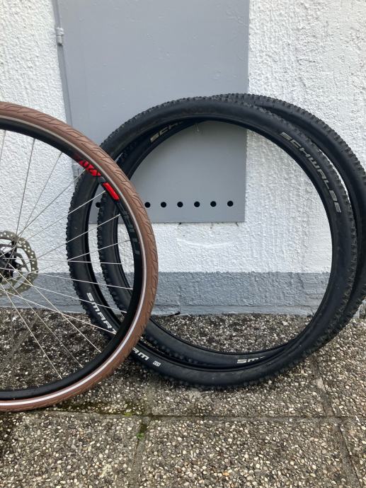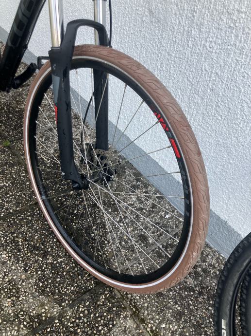 Na njemu gume za grad continetal 28’, a uz njega dolaze i orginalne vanjske MTB 29’ Schwalbe Smart Sam, Active, 2.1.
