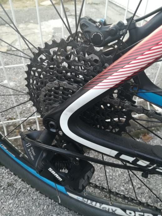 Bike je doslovno ko nov. Vožen cca 3000 km. 1X11 Sram NX (mjenjač, kazeta 11-42, shifter, lanac novi). Pogon ostao X0(promjenjen samo zupčanik, Sram 30T). Oprema je ta jer je to tada bila jedina opcija 1x11 od Srama. Mogucnost prodaje sa boljom opremom ali ne za ovu cijenu. Složen tubeless, nove gume Vitoria. Težak 10.2 kg, veličina 19(L). Ide bez sica na slikama i bez pedala. Cijena je stvar dogovora ali ne preko poruka. I nece ic za 8000 i sl. Zamjene isključene!!
