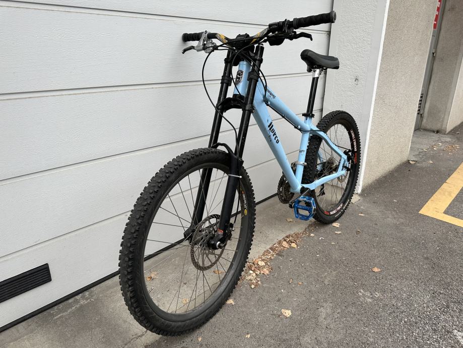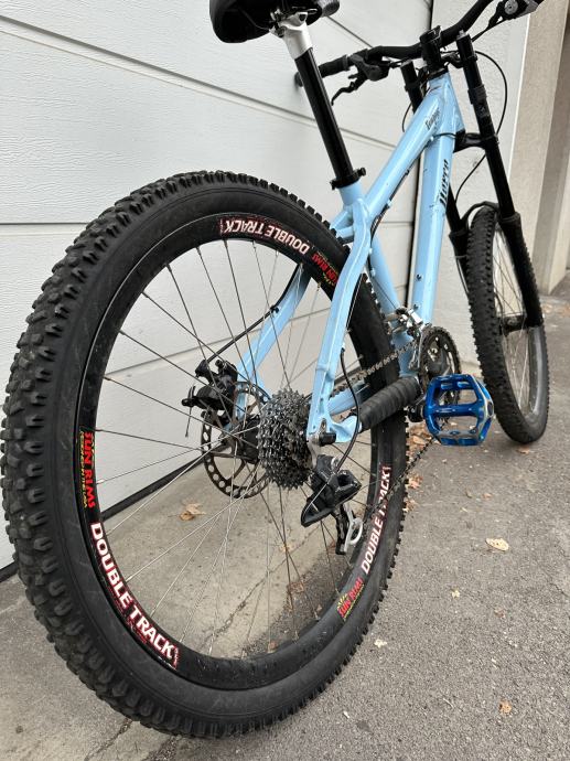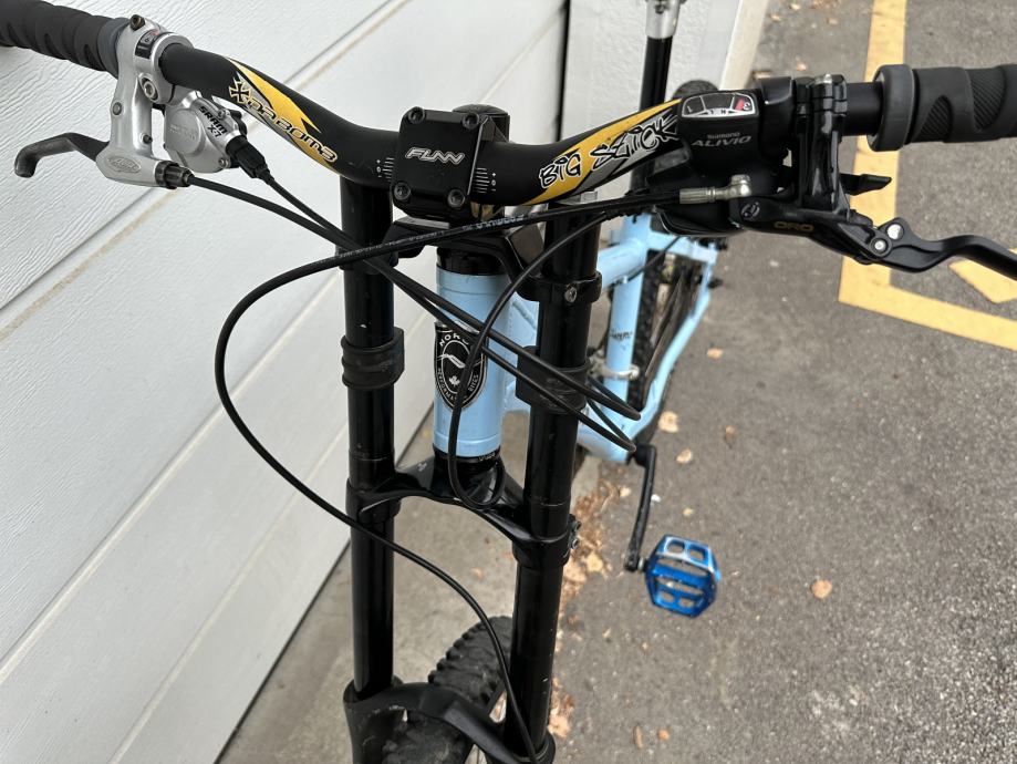 To je bio Kona bicikl, kojem sam malo po malo dodavao dijelove: nova rama (Norco Rampage), double crown vilica za downhill (mislim da je 180mm hoda), hidraulicka prednja disk kocnica sa rotorom od 200mm itd.