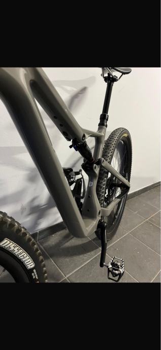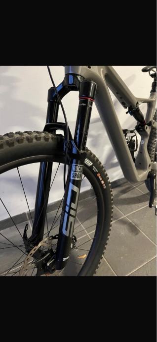 Bicikl ima full carbon ram i stražnji ovjes, što ga čini laganim i brzim na terenu. Opremljen je kvalitetnim komponentama, disk kočnice, RockShox vilica s plavim detaljima. Kotači su obučeni u terenskim gumama s agresivnim profilom.