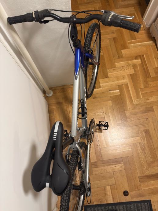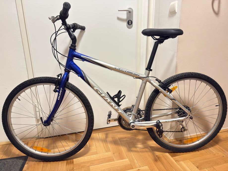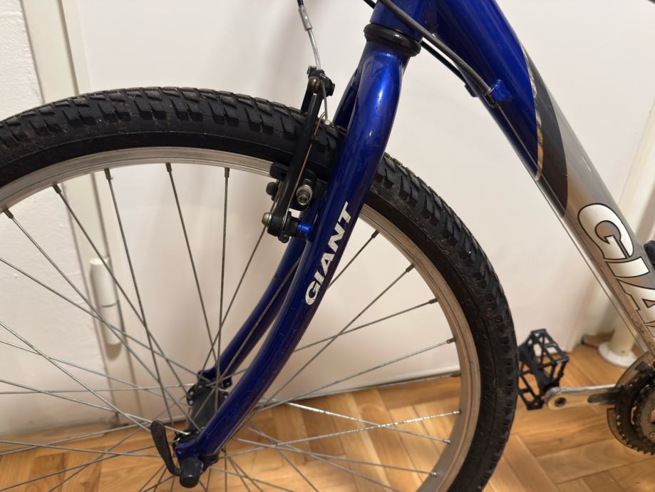 Prodajem lijepo očuvani MTB Giant, veličine kotača 26”, 3x6 brzina. Servisiran je, očišćen i podmazan. Spreman za vožnju bez dodatnih ulaganja. Stavljene nove pedale. Uz bicikl poklanjam i originalni pak-treger, koji se postavlja odozada.