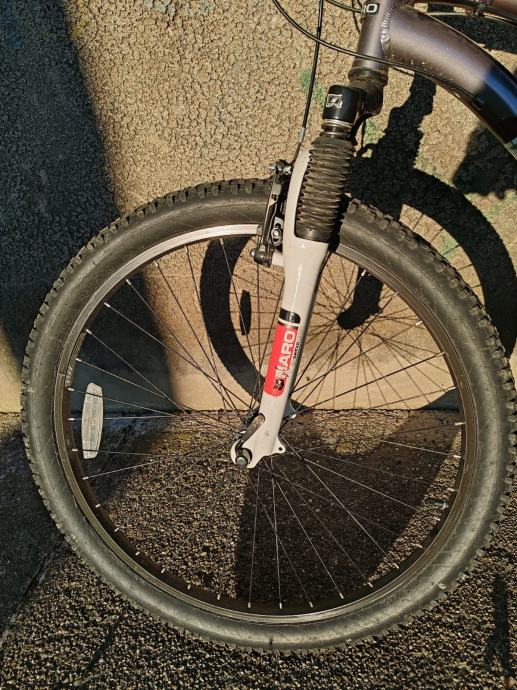 Bicikl ima 26-inčne kotače, potpuno novo sjedalo i gripove. Tu je i naknadno kupljen držač za bocu/bidon.