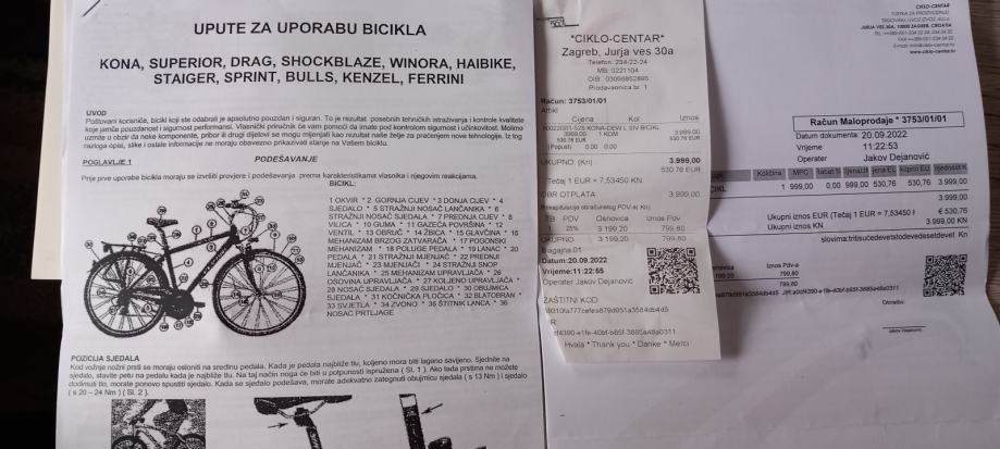 Alu rama za osobe do 190cm, kruta vilica, 16brzina, shimano altus oprema, nogica,servisiran, nosač bidona, 27.5cola dupla stjenka felge, tektro gemini hidraulične disk kočnice, nosač za bisage,s papirima