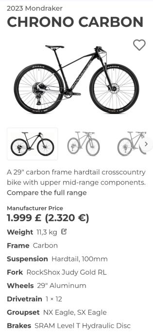 Mondraker je poznati proizvodac brdskih bicikala koji je stekao svjetsku reputaciju zahvaljujuci inovativnim tehnologijama i modernoj geometriji. Njihova Forward Geometry filozofija donosi vecu stabilnost, bolju kontrolu i sigurnost u voznji, zbog cega su Mondraker bicikli vrlo popularni medu sportskim i rekreativnim vozacima. Model Chrono Carbon predstavlja lagani i brzi cross country hardtail napravljen za vozace koji zele maksimalne performanse, malu tezinu i vrhunsku upravljivost.
