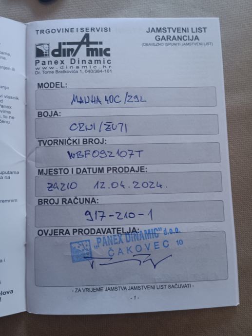 Kupljen u 4. mj. 2024 god., posjeduje servisnu knjižicu te redovitim godišnjim servisiranjem garancija mu je 5 godina.