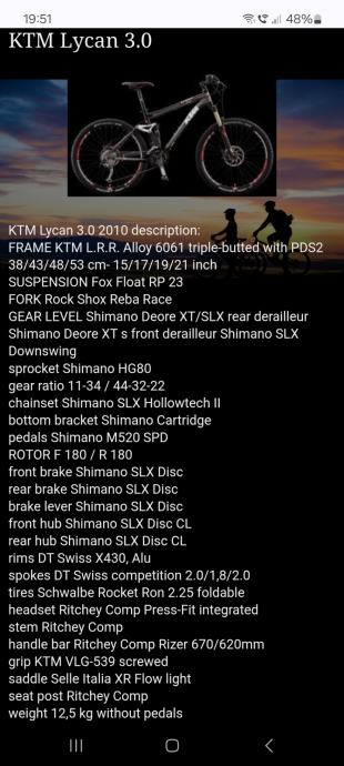 Očuvana Ktm Lycan mtb, rekreativno vožen. Veličine L. Potpuno ispravna, lani izvršena zamjena prednjeg i zadnjeg prijenosa, lanca, pakni, servis zadnjeg amortizera. Od onda vožena par puta. Gume skoro nove (26 ). Jako kvalitetna i očuvana. Većinom vožena po asfaltu, nikad korištena za skakanje i van ceste.