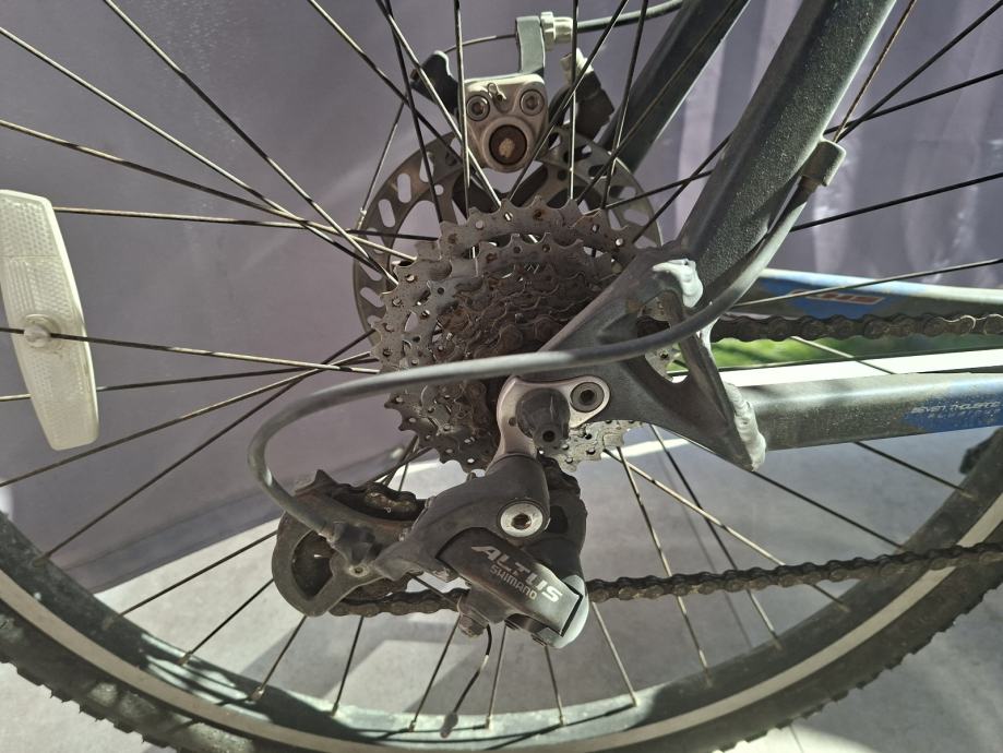 Prodajem KHS MTB bicikl u tamno plavoj boji, veličine rame 21 inč, muška geometrija. Kotači su 26 inča, a bicikl je opremljen disk kočnicama sprijeda i straga te Shimano Altus stražnjim mjenjačem s 21 brzinom.