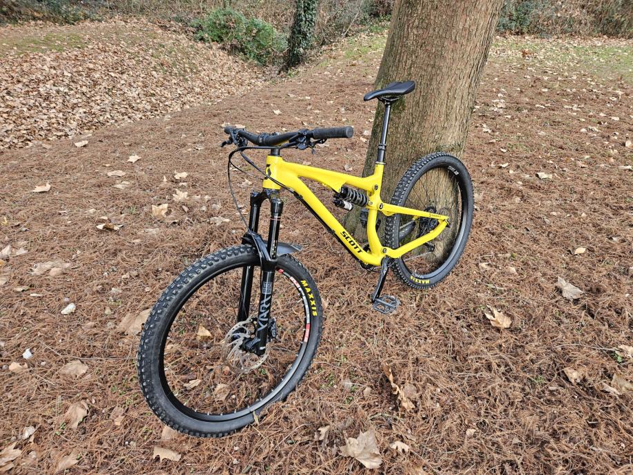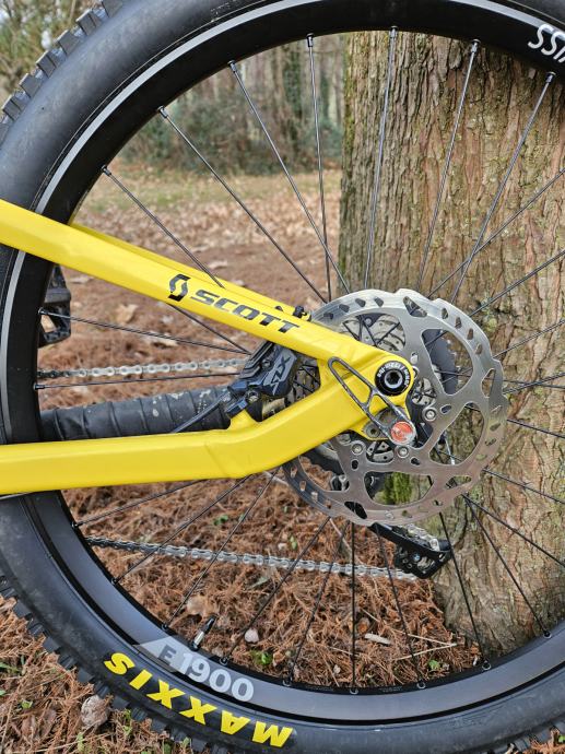 Rama: Scott Genius 730, aluminij, M veličina, 27.5“, 150mm hoda, plastificirana u žutu boju u 05.2023., s crnim naljepnicama (poklanjam 2 seta naljepnica), stavljeni novi ležejevi u 05.2023.