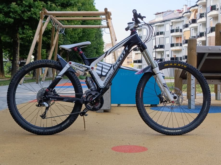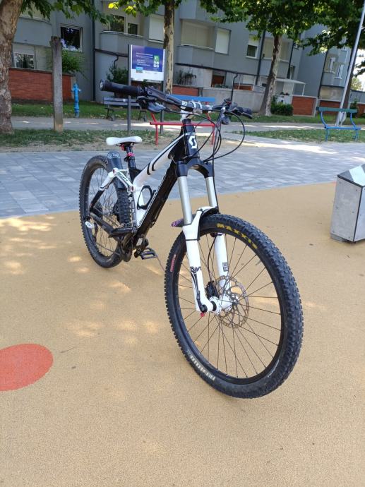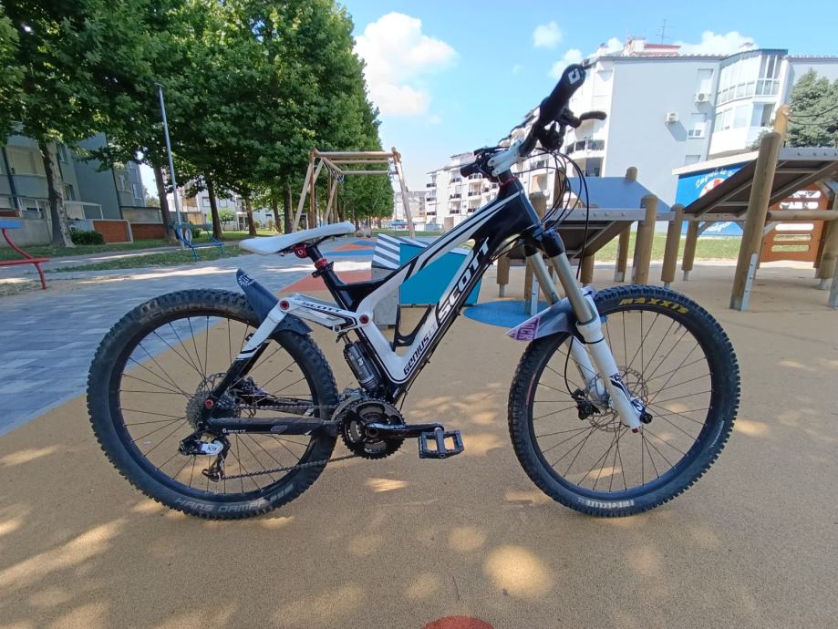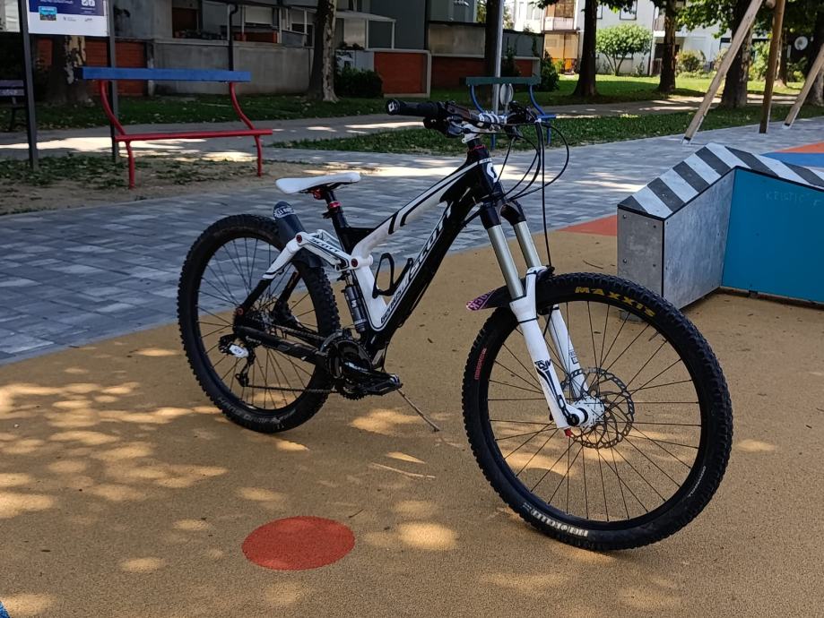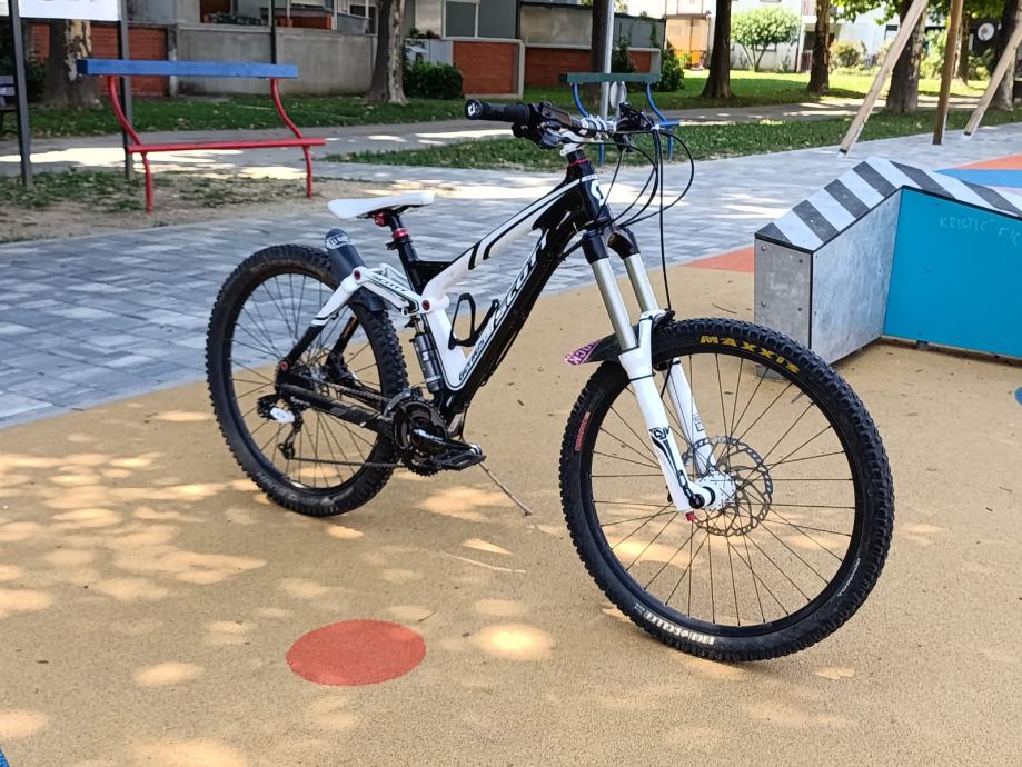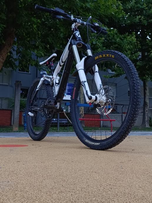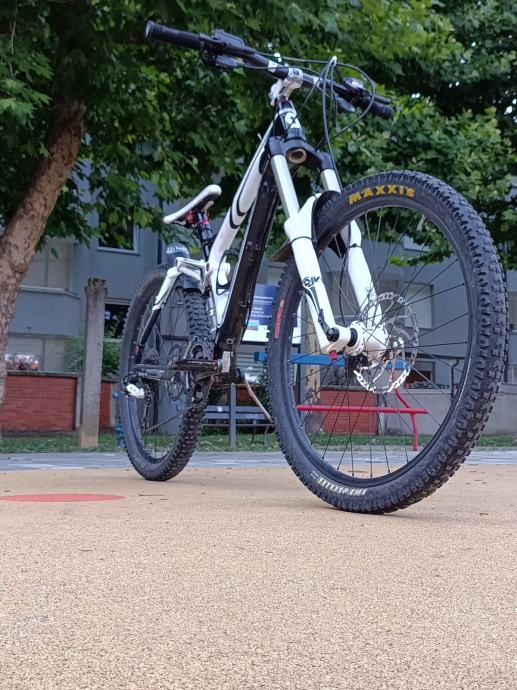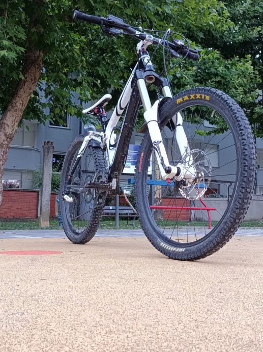 Gume 26 inča(potrebno zamjeniti) , širine 2.35 sa prednjom vilicom od 180mm travela. Odostraga 10 brzina i velicina rame S.