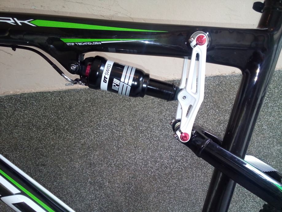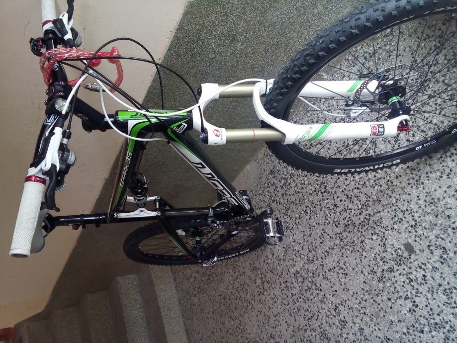 Sram x9 shifteri i zadnji mjenjac, prednji shimano slx. Rock shox reba zracna vila radi kao nova, zadnja suspenzija dt swiss isto tako savrsena kao prvog dana. Mogucnost zakljucavanja obje suspenzije preko twinlock rucice na guvernalu.