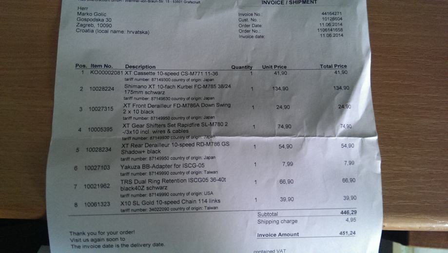 U 7mj 2014 su stavljeni novi djelovi od Shimana XT 2014 godina u Bizmarku. Račun od djelova prilažem uz bicikl (vidljivo na slici).