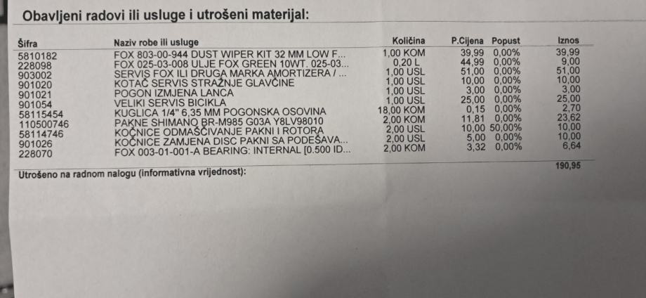 Bicikl je pažen, nikad padano, nikad vidio Sljemena ili sličnih DH ruta. U bicikl je uloženo jako puno, a kompletan servis bicikla uključujući i ful servis prednje vilice i zadnjeg shock-a odrađen prije tri tjedna u Viva Sportu, prilažem račun.