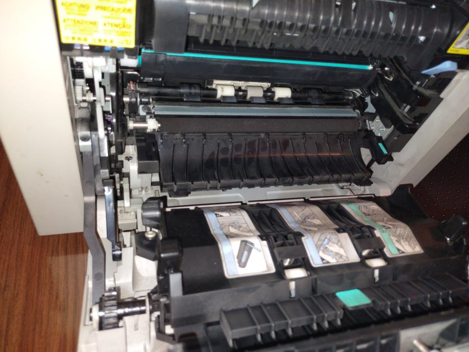 Mehanizam za uvlačenje papira -- i iz ladice i iz bočnog ulagača -- djelomično povuče papir i onda počne mehanički "škljocati" ili "preskakati" bez da obavi uvlačenje papira.