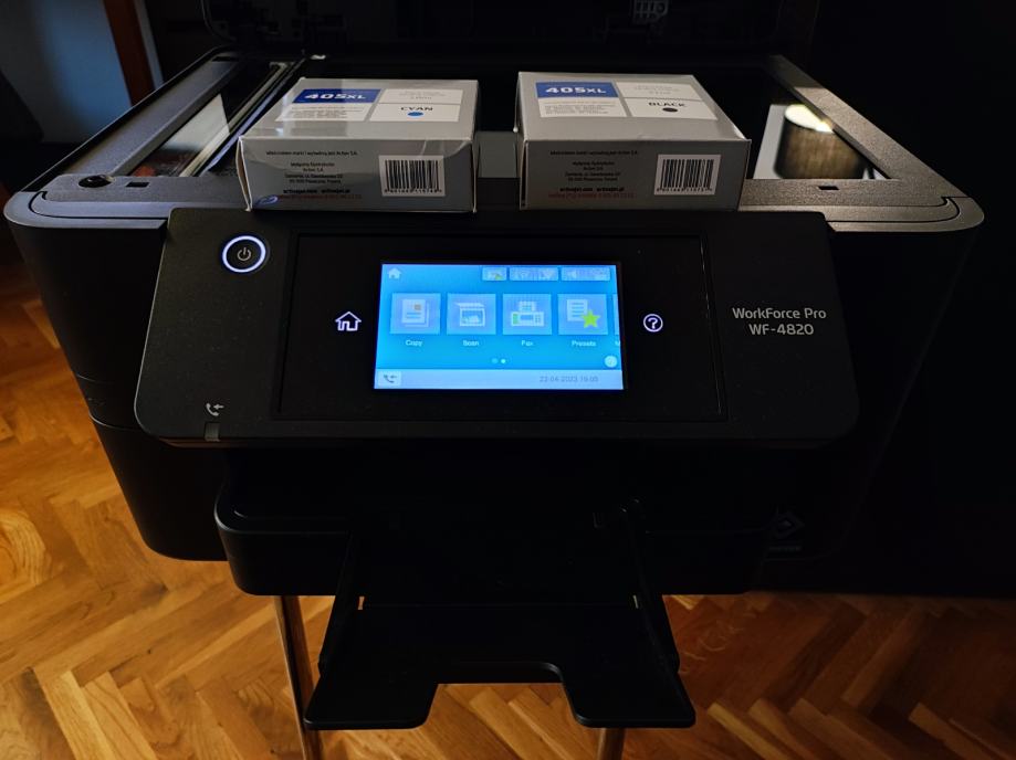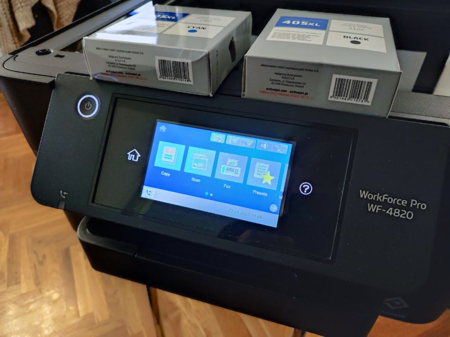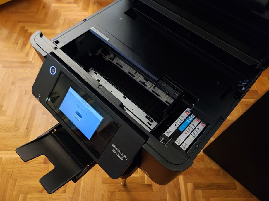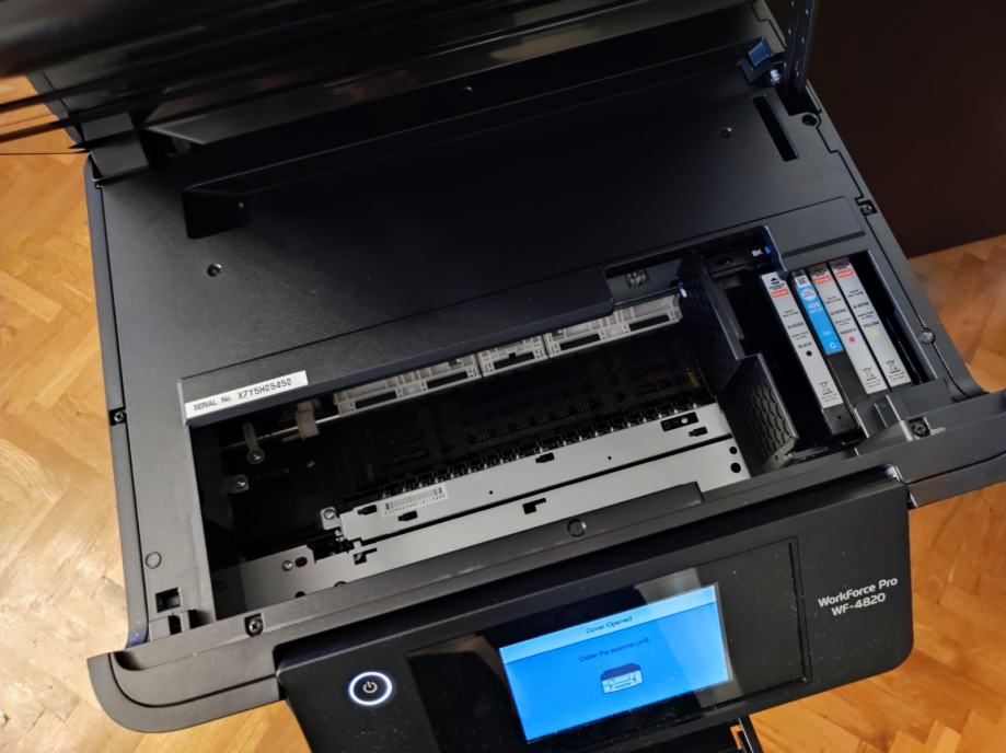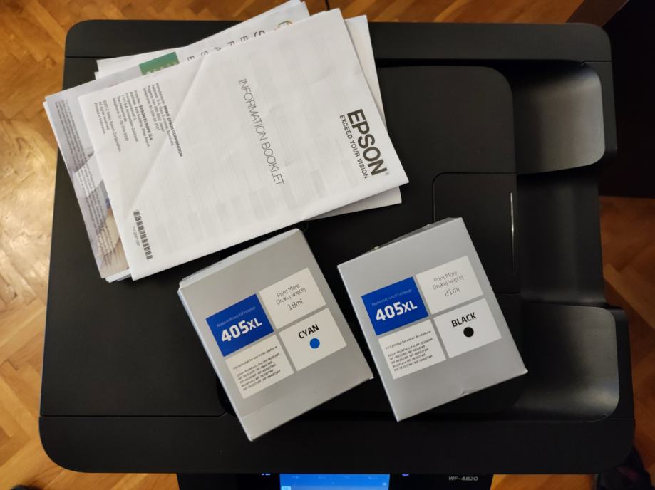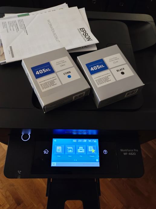 Na prodaju malo korišteni EPSON WorkForce WF-4820DWF multifunkcijski all-in-one printer/skener/fax idealan za mali ili kućni ured i za sve vaše potrebe. U odličnom stanju, odrađen je mali ispis, cca 500-600 stranica i još uvijek je sa setup Cyan patronom koja je pri kraju, no uz printer prilažem i novu, u kutiji, patronu Cyan XL te još jednu Crnu kartušu XL.