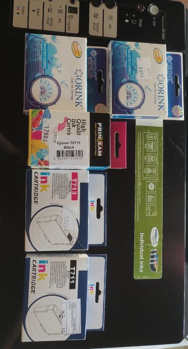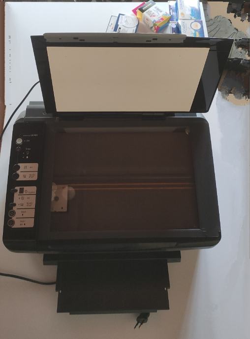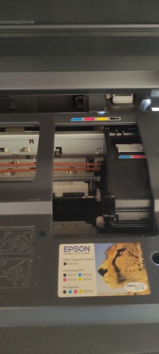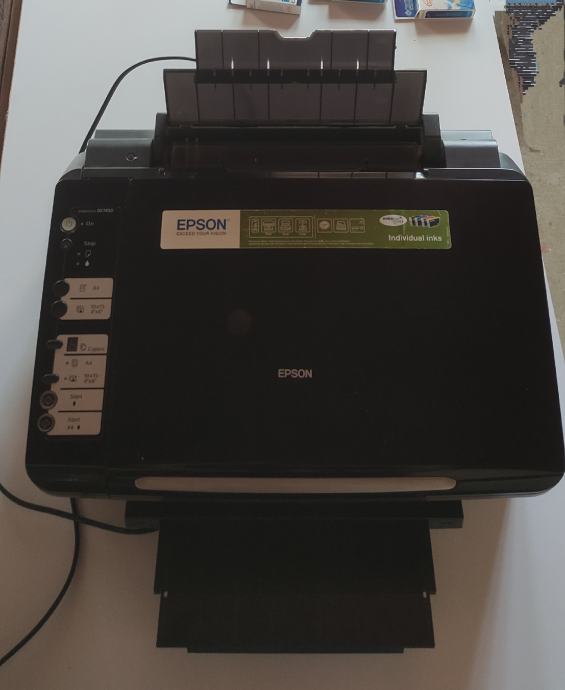 _0981660044_Prodajem rabljeni multifunkcionalni uređaj, skenira odlično, printa relativno ok što je vidljivo u priloženom videu. U printeru je set novih boja te uz te dobivate još jedan set kompatibilnih tinti na poklon. Tinte su Epson T0711, T0712, T0713, T0714 i vrlo su povoljne od oko 2- 4 eura. Dolazi sa kablom za napajanje. Može se i isprobati prije kupnje. Cijena svega je 25 eura koliko su otprilike koštala dva seta novih tinti koje dobivate uz printer- skener.