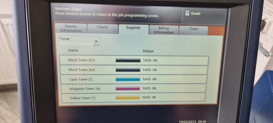 Mi smo stroj generalno servisirali, ugrađena su dva nova bubnja, novi IBT Belt i grijač (fuser) te je stavljeno novih 5 tonera - sve ja na 100%. Developeri su dobrom stanju, sve boje su čiste i tonovi puni.