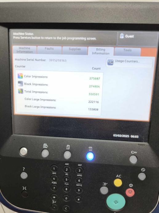 Ima 276000 kolor otisaka i 275000 crnobijelih otisaka = što je u totalu 550000 otisaka. Vidljivo na slici.