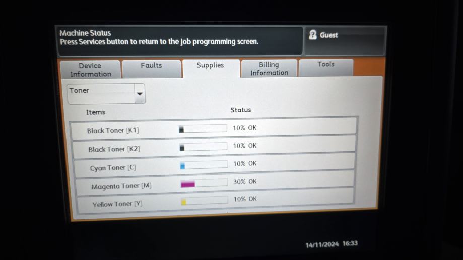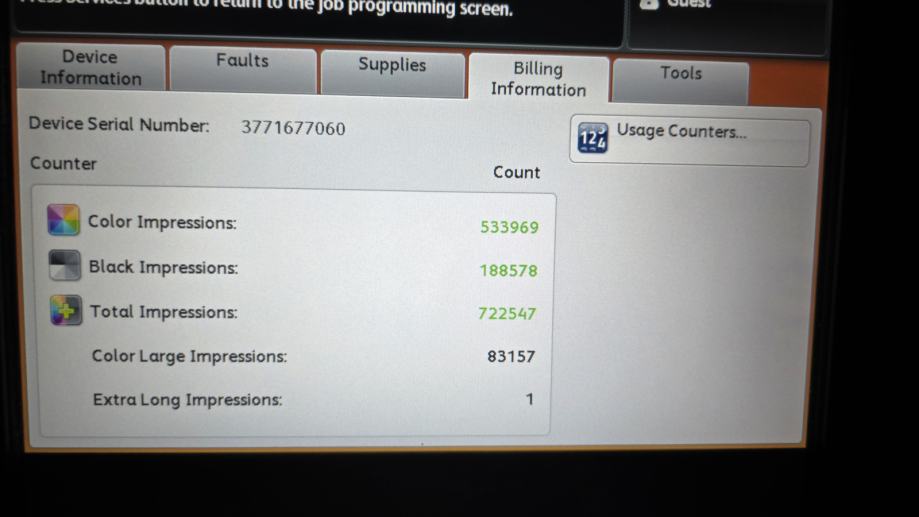 Stanje brojača je vidljivo na slikama, potrošni su svi OK, toneri u prosjeku 10% - uz stroj ćemo isporučiti 5 novih tonera.