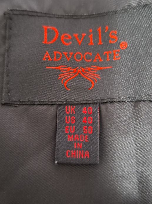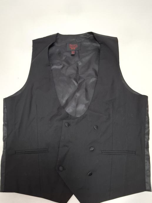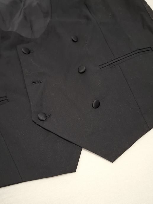 Prodajem jednom obučeni svečani prsluk, crne boje, vel.50, marka "Devils advocate". Prsluk je bez oštećenja i fleka, očuvan, s leđa ima materijal kao svila i ima za regulaciju da se može stegnuti, s prednje strane ima gumbe koji se mogu kopčati. Mjere: dužina 63cm, šiina 50cm, širina otvora rukava 27cm, širina oko vrata 15cm.