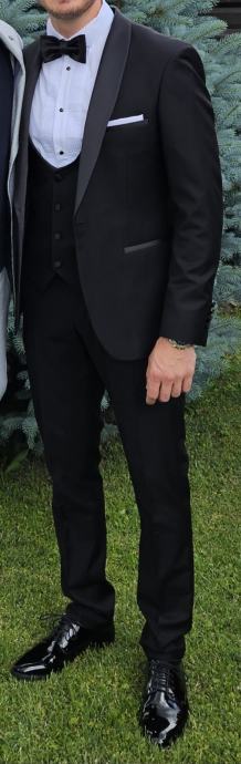 Crni talijanski smoking (48), ovalni prsluk, košulja (M) i mašna
