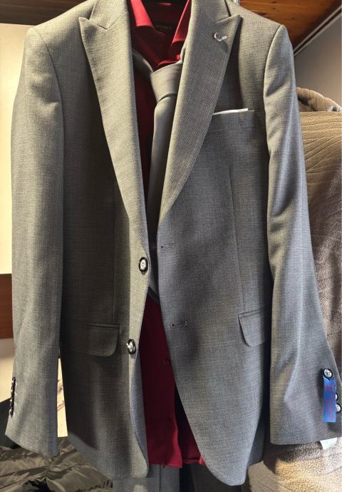 Novo odijelo nikad nošeno, komplet : hlače, sako, košulja, kravata, čarape, zaštita za odijelo