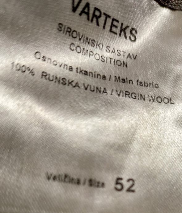 Prodajem novi, vrlo kvalitetan muški sako, marke Varteks. 100 % runska vuna, veličina 52. Dužina rukava 67 cm, a širina prsa 54.