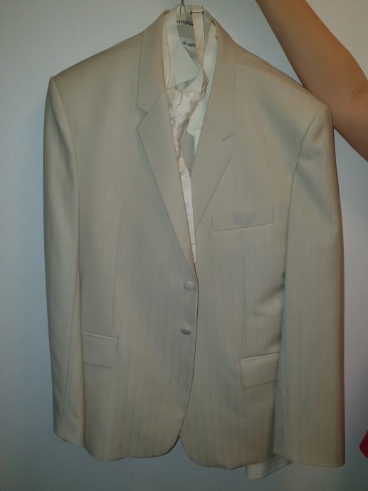 Prodajem muško odijelo, jednom nošeno, hlače, košulja, prsluk, kravata, sako, visok sam 180, težina 80kg, cipele veličina 42, sve boje šampanjca