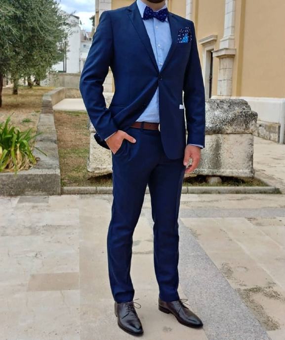 Veličina 50, tamno plavo, ko novo. Jednom nošeno na vjenčanju.