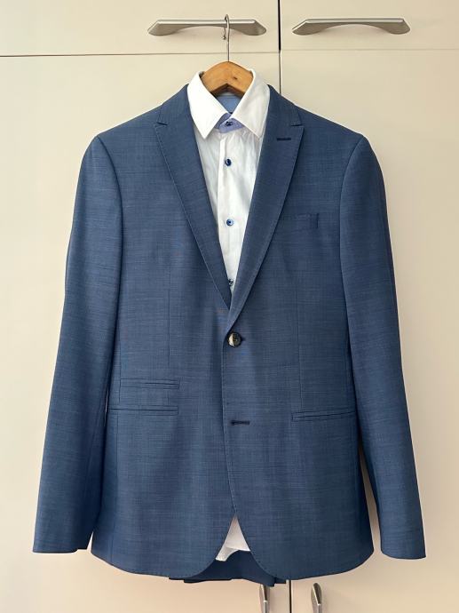 Odijelo za mlađu mušku osobu tj. mladića. Plave boje. Idealno za Krizmu ili maturalnu večeru. Jednom nošeno. Veličina 34R. Kemijski očišćeno. Košulja gratis.