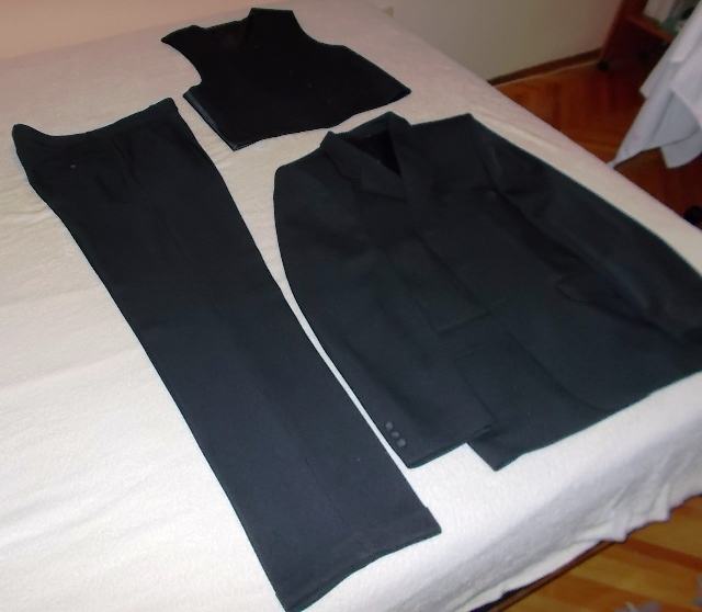 Odjelo klasičan kroj, nošeno jednom, ima hlače, prsluk i sako.