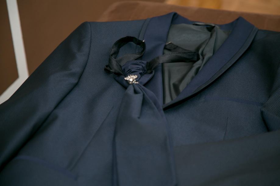 Boja odijela je tamno plava. Odijelo je broj 54, a košulja L.