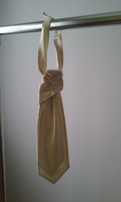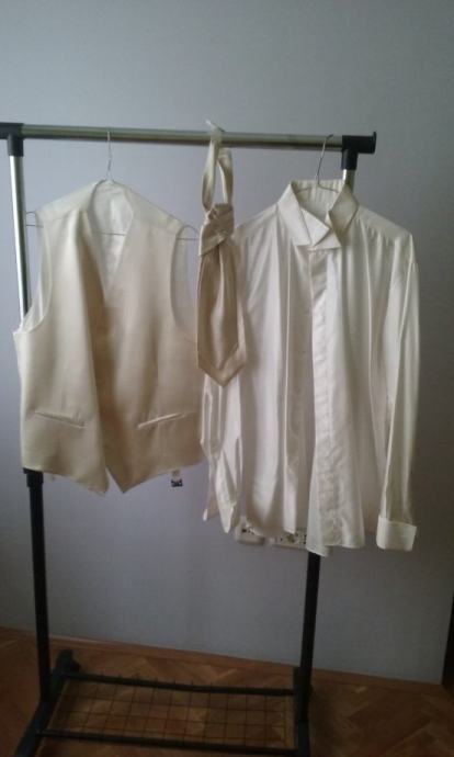 Prodaje se prekrasno jednom nošeno svečano odjelo tamno smeđe boje sa efektom. Uz odjelo dolaze i pripadajuća sjajno bijela košulja, prsluk i plastron boje slonovace,manžete, remen i kožne smedje cipele. Veličina odjela je 56( opseg struka 105) , cipela 40 (odgovaraju vel.41). Odjelo je Martin Arbanas, a cipele Jelen.